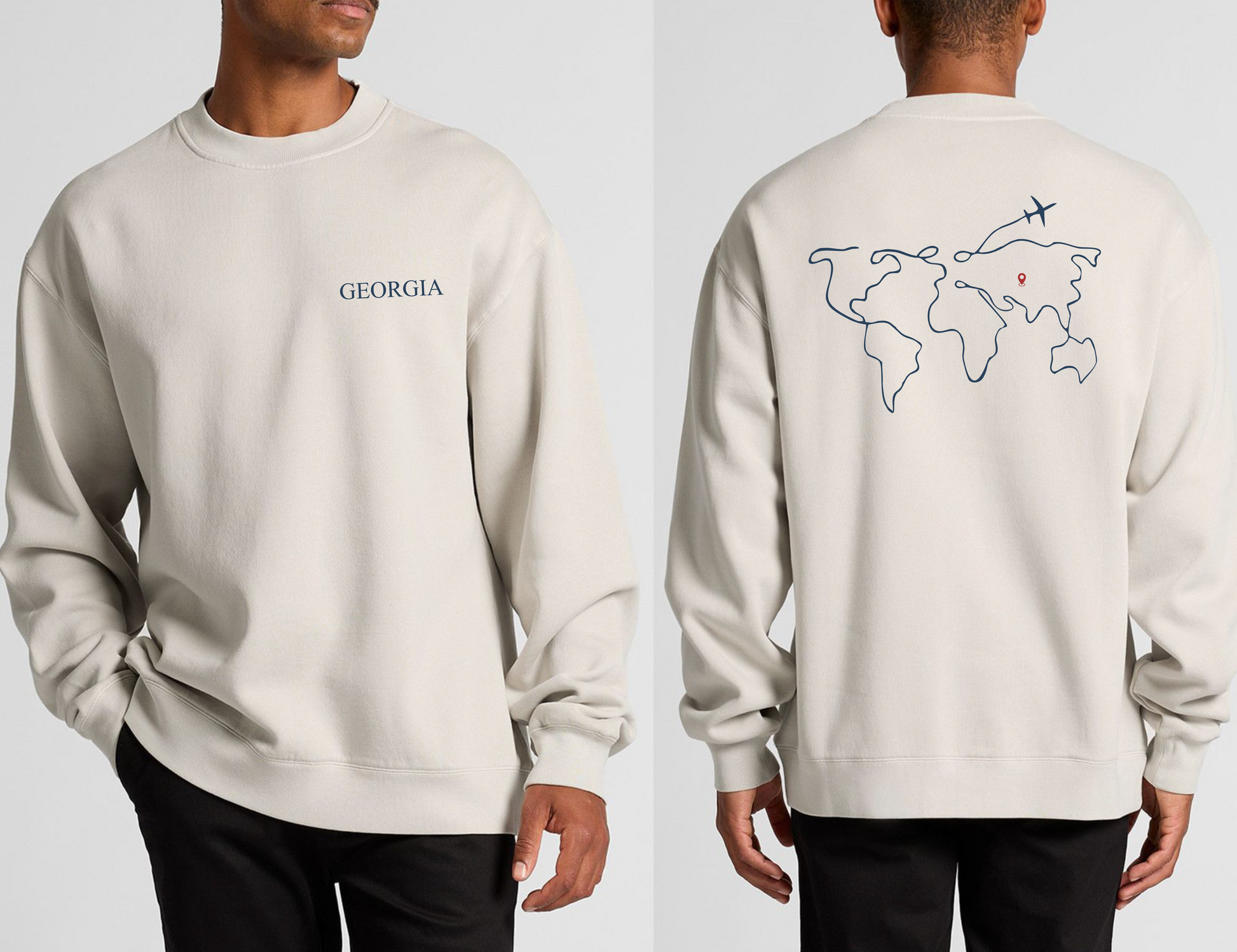 This detailed crew back design features a world map with an airplane highlighting Georgia, emphasizing global connections and travel expertise. Ideal for those passionate about geography or aviation, it combines functional style with a distinctive visual narrative.