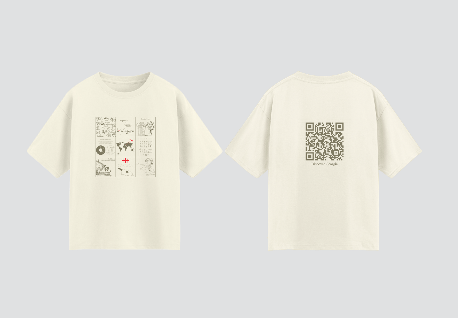 The print highlights various elements of Georgia, including its location, traditional Georgian dance, and Chakrulo—a song that was sent to the moon—along with the national flag, cuisine, and detailed aspects of the Georgian alphabet, offering an expert representation of the country's cultural richness.
