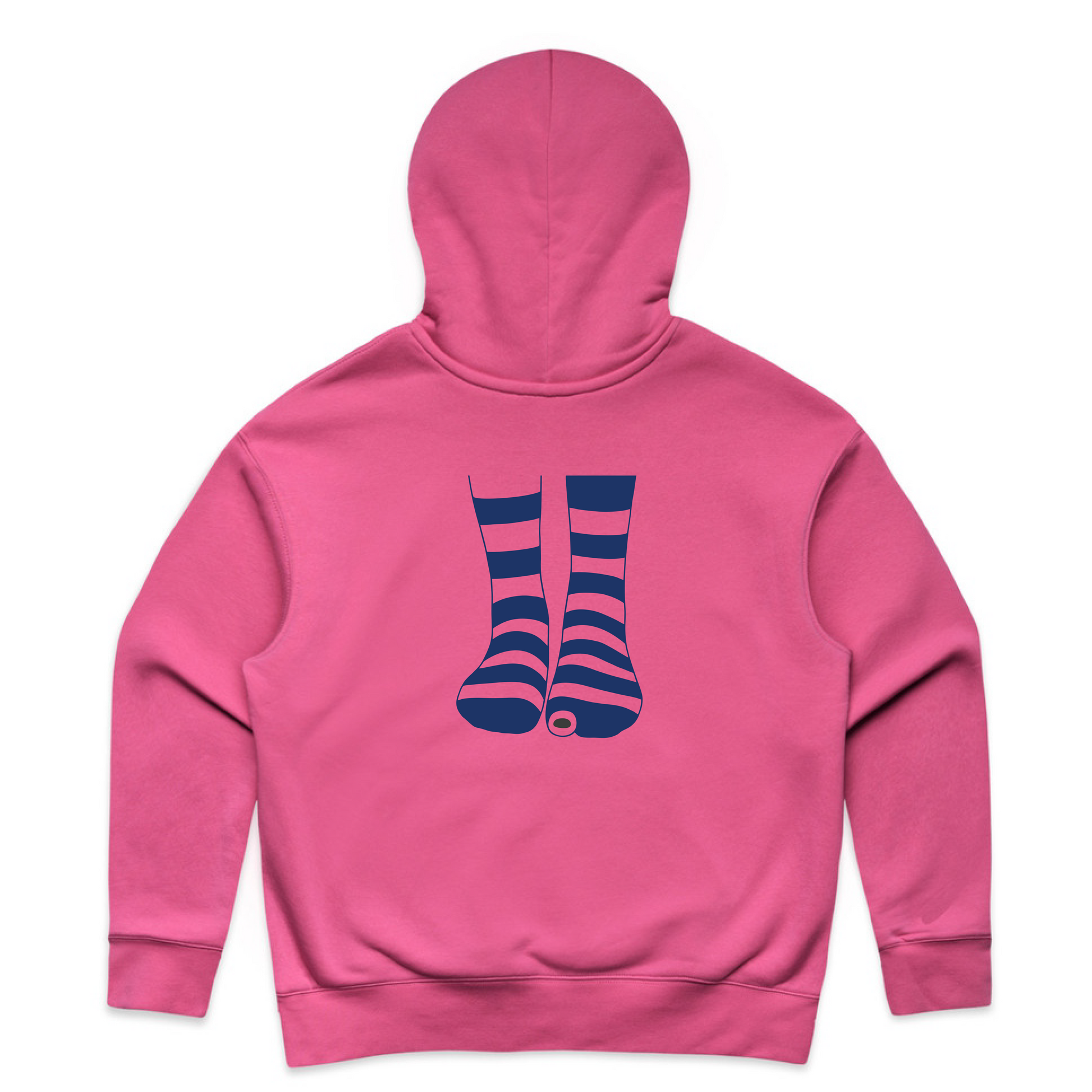 The back graphic gives the hoodie its signature charm: two mismatched striped socks, standing side by side, with a smooth minimalist line-art style that pops beautifully against the bright pink fabric. It’s the perfect combination of cute, quirky, and stylish.